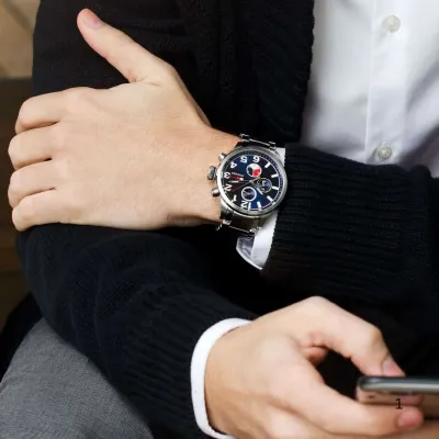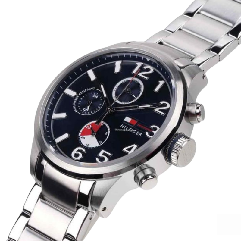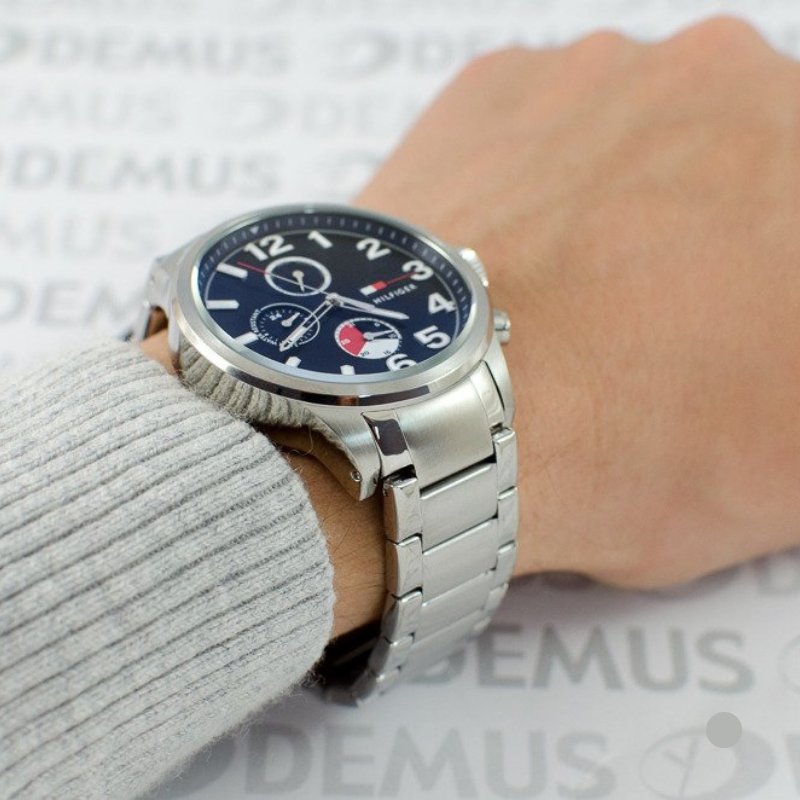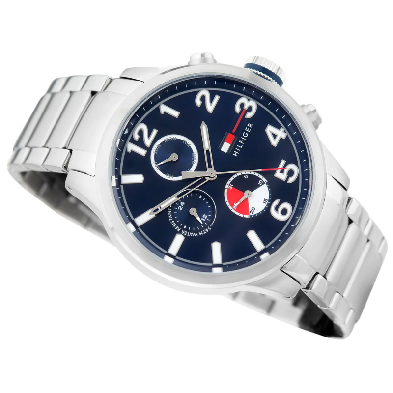 The Tommyguy Modern casual for . This timepiecefeatures a stainless-steel case and bracelet. Navy sunray multi-function dialhas half stick markers & half arabic numerals creating a unique twist.
