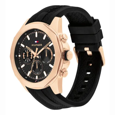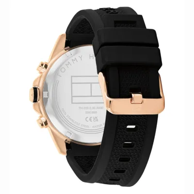 The Tommy HilfigerLars 1710650 is a bold and modern timepiece, perfect for men who appreciatesleek aesthetics and durability. Featuring a 46mm rose gold-plated stainlesssteel case, it pairs seamlessly with a black silicone strap for a sophisticatedyet sporty look. The index hour markers on the black dial enhance its elegantappeal, while the pin buckle closure ensures a secure and comfortable fit.