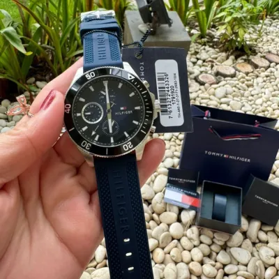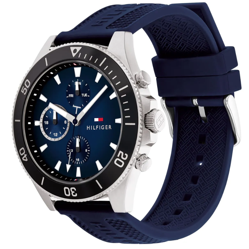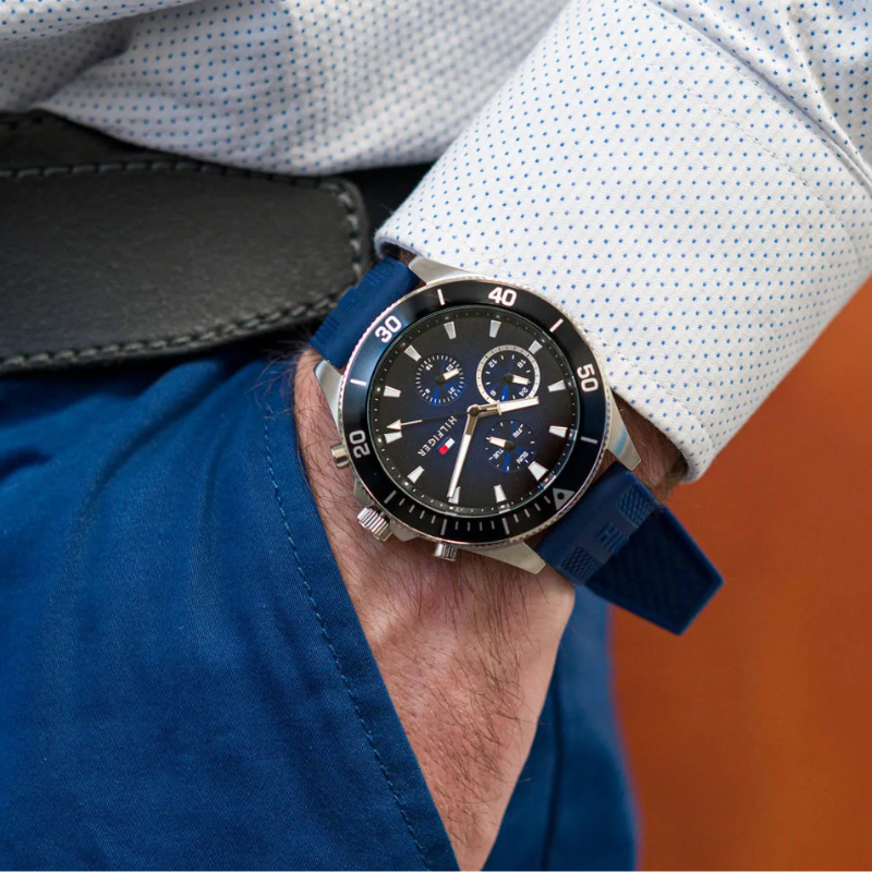 The Tommy Hilfiger Men's Quartz Silicone LarsonWatch 1791920 is not just a watch but a symbol of modern fashion andversatility. With a water resistance of 50 meters, it's well-prepared to handledaily life's challenges, including light water exposure. The watch boasts acaptivating design with its stainless steel case, blue bezel, and a comfortablesilicone strap. Whether you're at work or enjoying your leisure time, this timepieceensures you remain punctual and fashionable, enhancing your overall style. Itscontemporary and sporty design adds an extra layer of charm to your daily look.