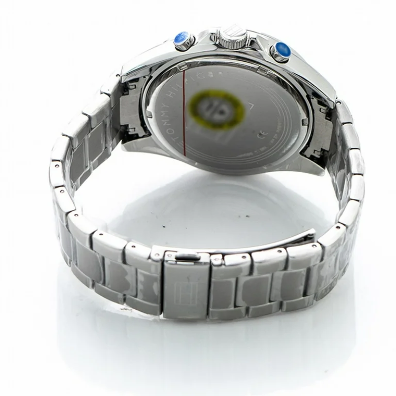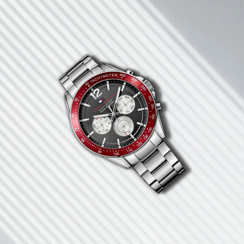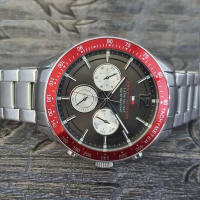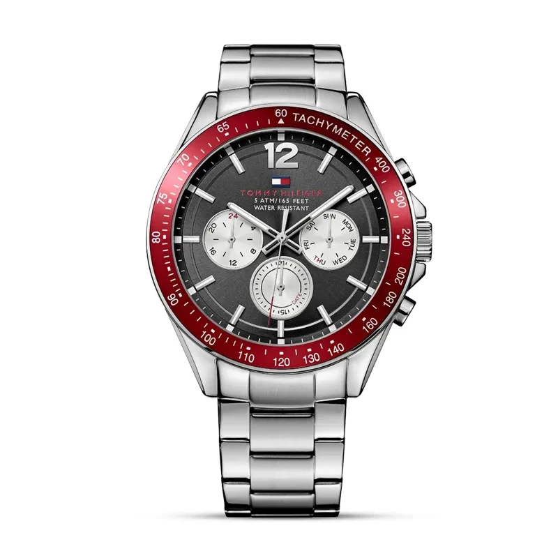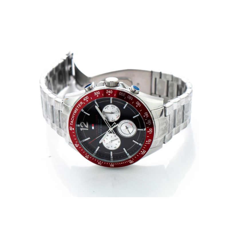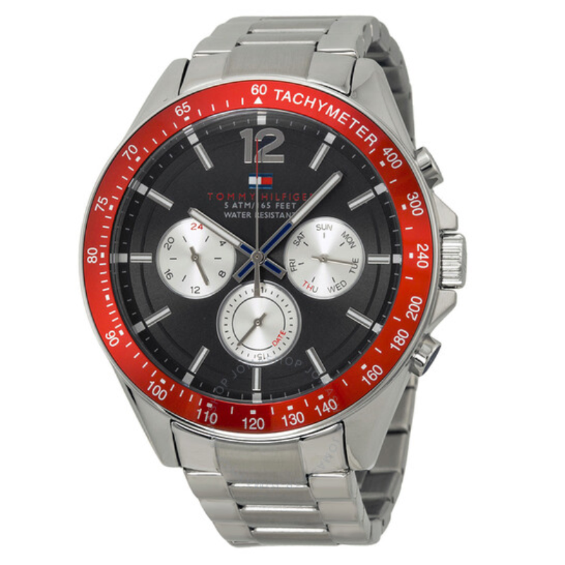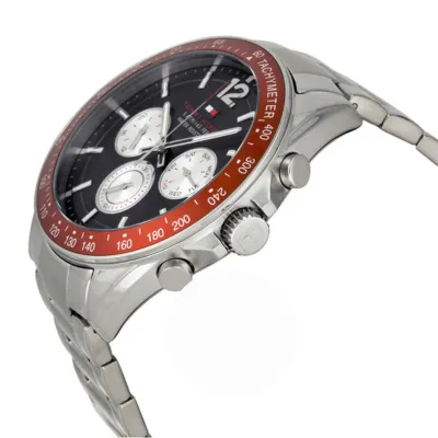 Stainless steel case with a stainless steel bracelet. Fixedstainless steel bezel with red top ring showing tachymeter markings. Black dialwith luminous silver-tone hands and index hour markers. An Arabic numeral marksthe 12 o'clock position. Minute markers around the outer rim. Dial Type:Analog. Luminescent hands and markers. Three multi-function sub-dialsdisplaying: 24 hour, date and day of the week. Quartz movement. Scratchresistant mineral crystal. Solid case back. Case diameter: 46.5 mm. Casethickness: 12 mm. Round case shape. Band width: 21.5 mm. Tang clasp. Waterresistant at 50 meters / 165 feet. Functions: date, day, hour, minute, second,24 hour. Casual watch style. Tommy Hilfiger Luke Multi-Function Black DialStainless Steel Men's Watch 1791122.