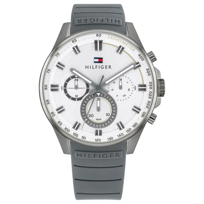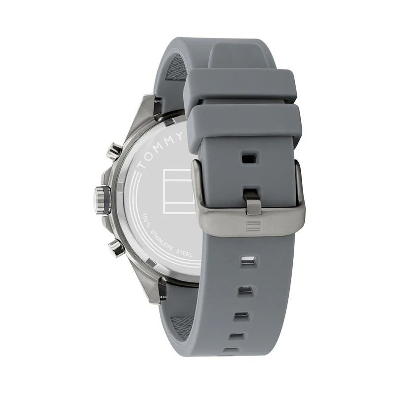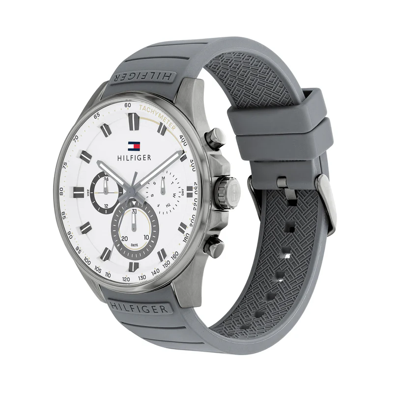 Indulgein timeless sophistication with the tommy Hilfiger Max Multifunction GreySilicone Strap Watch. With its sleek design and multifunctional capabilities,this watch is the perfect accessory for any occasion. Crafted with a greysilicone strap and state-of-the-art watch technology, this piece exudes luxuryand exclusivity. Elevate your style with Tommy Hilfiger