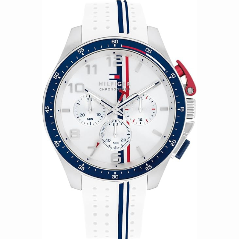 Stand out with this Tommy Hilfiger Chronograph men’s watch, featuring a clean white dial, bold navy bezel, and a sporty white silicone strap with blue stripes. Designed for comfort and everyday performance, it’s an ideal choice for office wear, casual styling, and gifting.