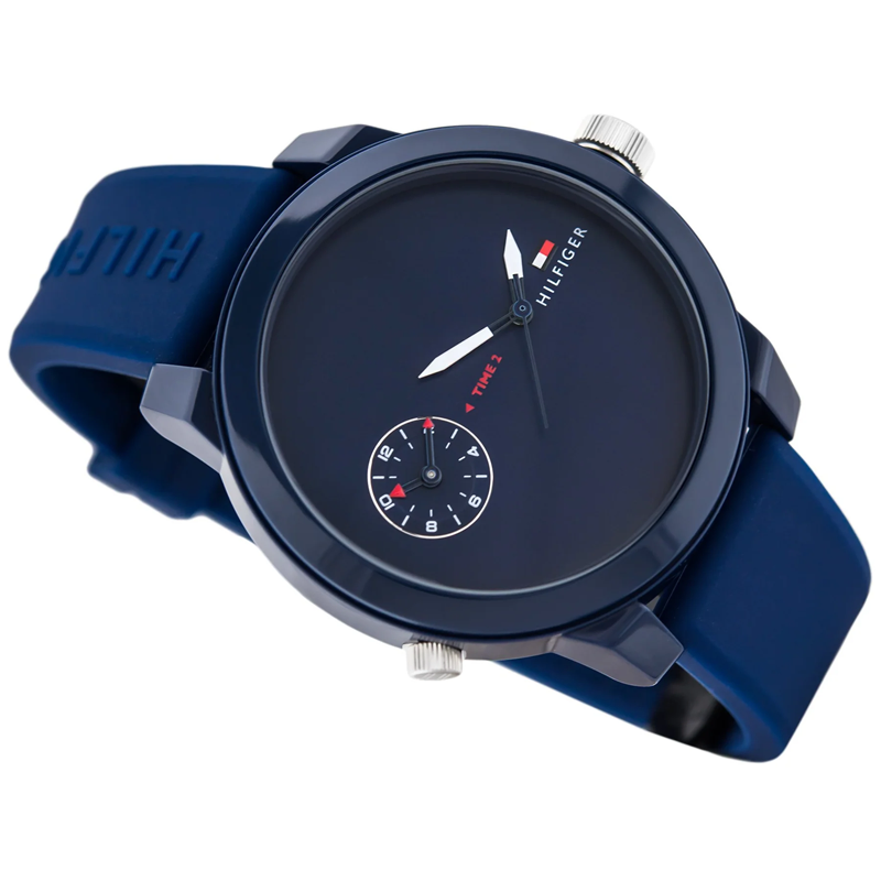 Aniconic sports watch with true Tommy DNA. The bold blue case features a dualtime dial. The elegant blue silicone strap is embossed with the signatureHilfiger logo. The Tommy flag, positioned at 3:00, completes the look.