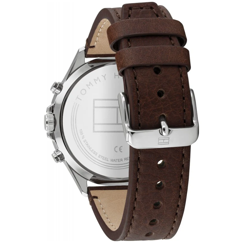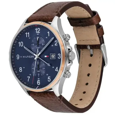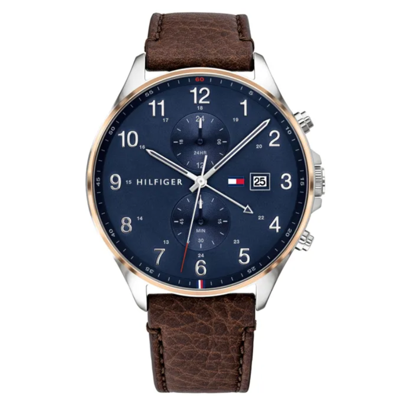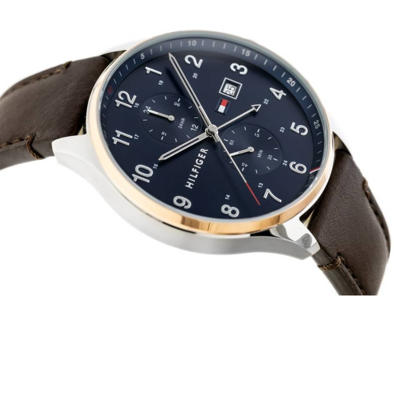 ITEM SHAPE Unlocktimeless style with Tommy Hilfiger's Dark Brown Leather Men's Multi-functionWatch. Crafted with a two-tone stainless steel case, mineral crystal, and darkbrown leather strap, this classic accessory will add a touch of sophisticationto your look. Plus, with a 5 ATM water resistance and tongue buckle clasp, youcan stay worry-free, wherever the day takes you.
