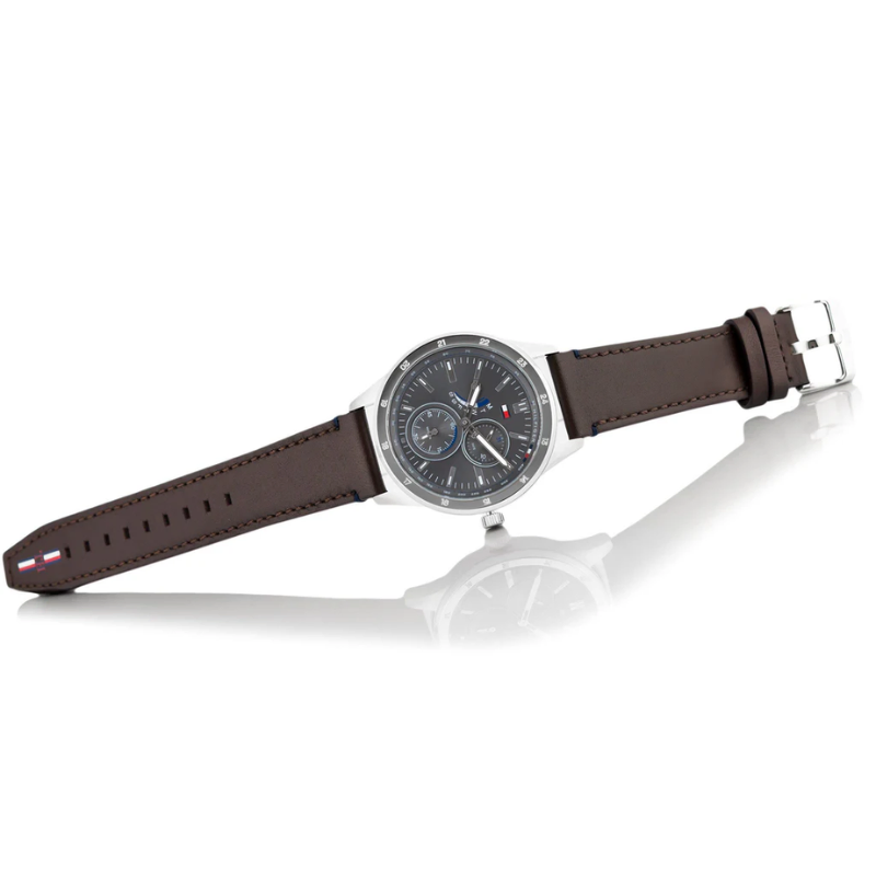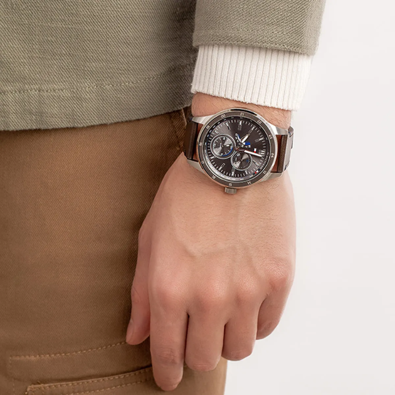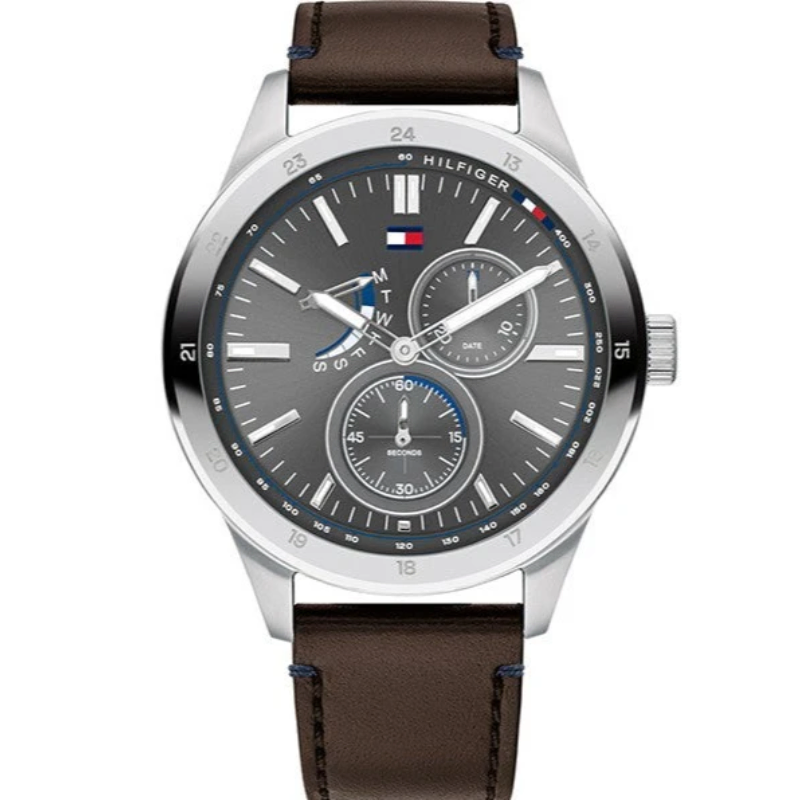 Explore the eleganceand style of the Tommy Hilfiger Austin Grey Dial Brown Leather Strap Watch forMen - 1791637. Featuring a sleek grey dial, this watch exudes sophisticationwhile the brown leather strap adds a touch of masculinity. Crafted with qualityand precision, this timepiece is perfect for any occasion.