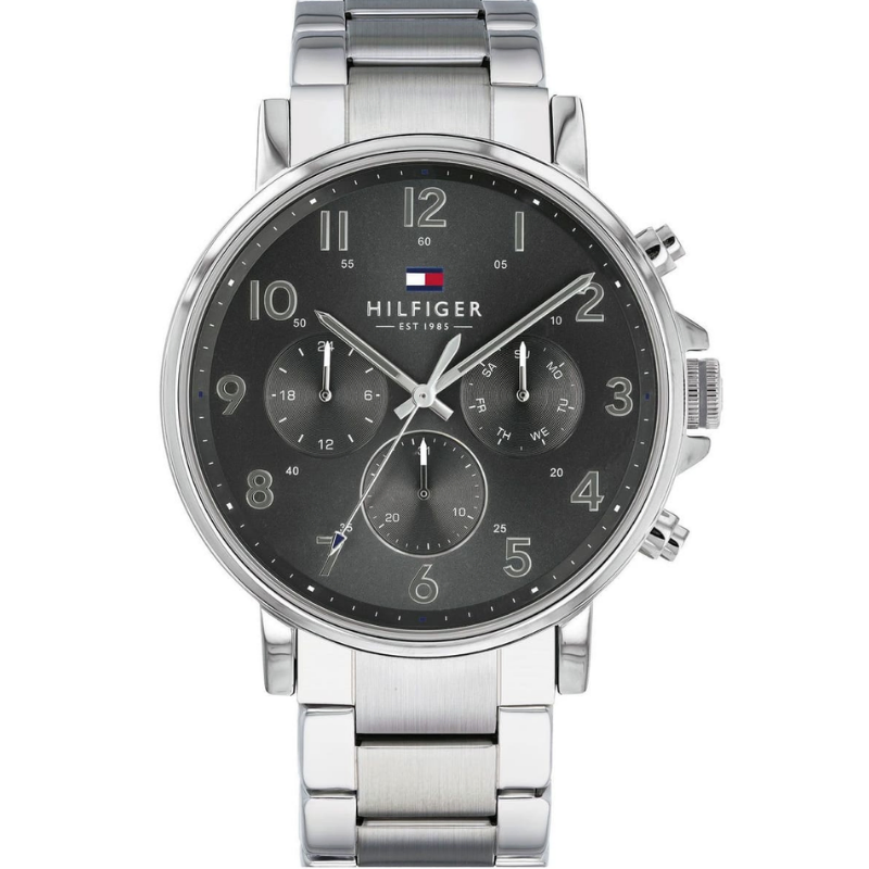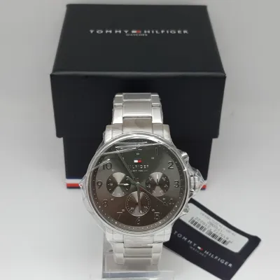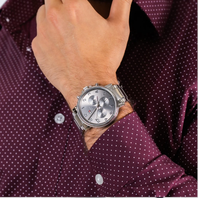 A dressed-up classic, this watch features a solid stainless steel case and bracelet. The multi-function sunray dial has Arabic numerals and a minute detailed outering. It's a Tommy Hilfiger classic.