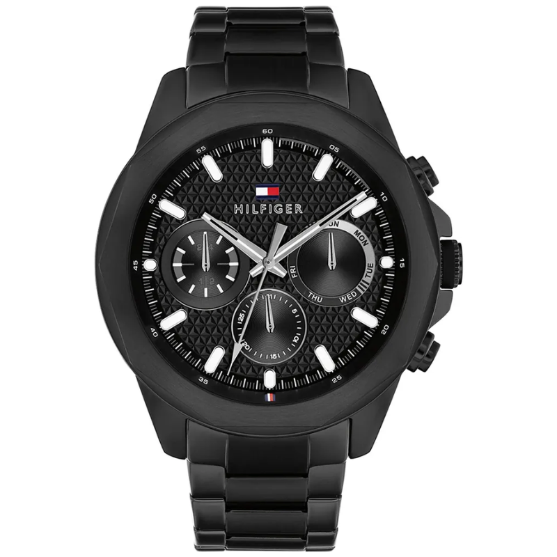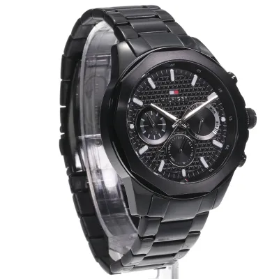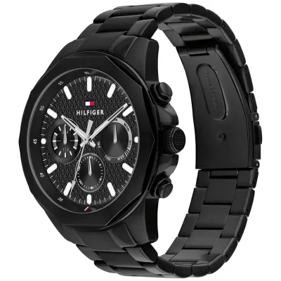 This men's black chronograph watch has a superior all-black finish and a striking, a athletics style.