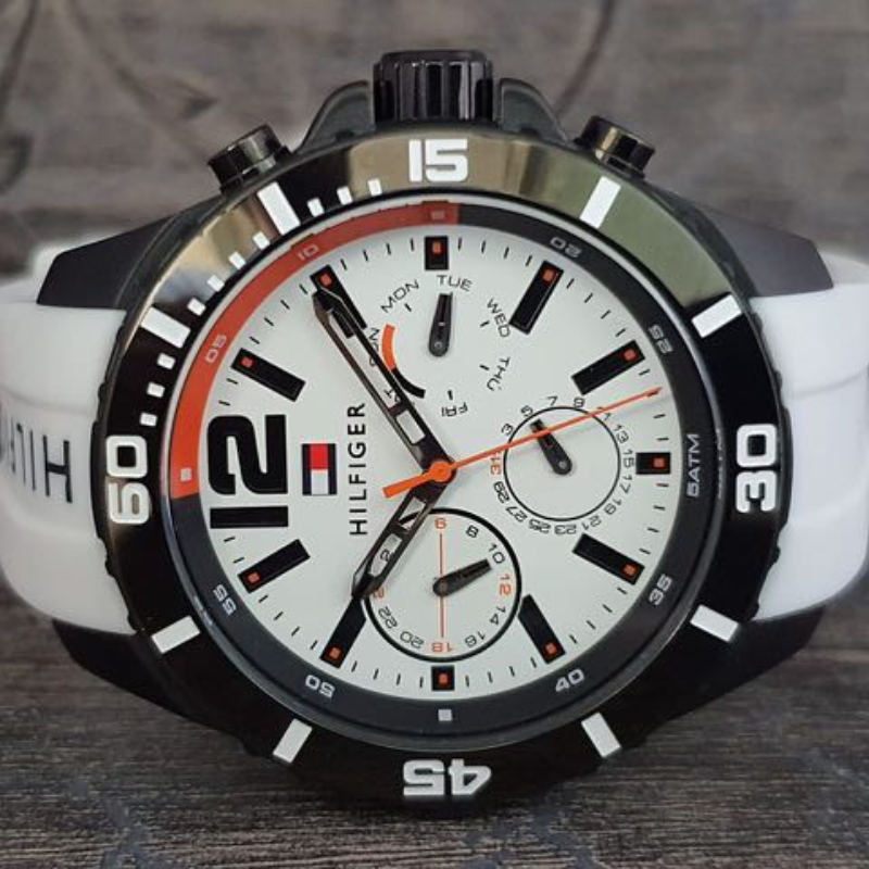 Japanese Made Quartz Chronograph Movement. Date Indicator.Day Indicator. 46mm Black IP Plated Stainless Steel Case. Scratch ResistantMineral Crystal. Unidirectional...