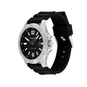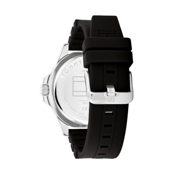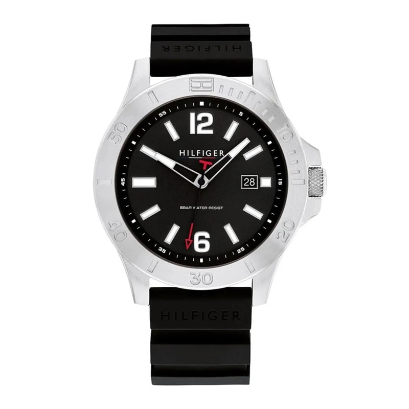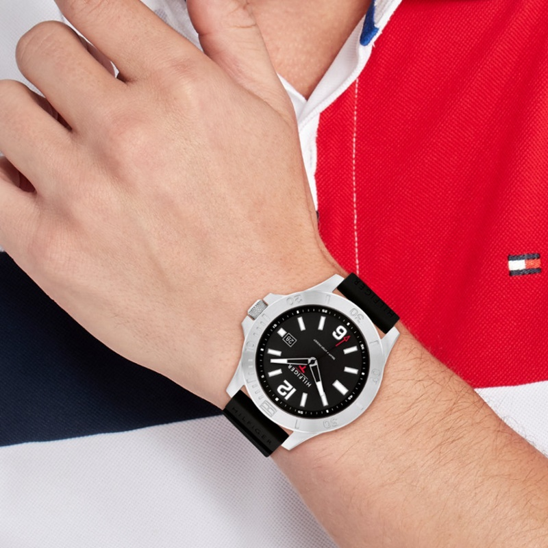 Blending functionality and style, this men's analog watchfrom the Ryan collection by Tommy Hilfiger is a must-have. Its black round dialis housed in a 46 mm case. It displays plain three hands functional on a quartzmovement and a crown for time adjustment. Its silicon strap vaunts a green huethat enhances the look of the watch. Besides, it is completed with a buckleclasp to ensure a secure fit on the wrist.