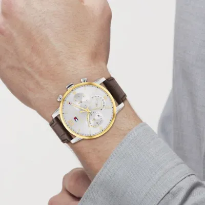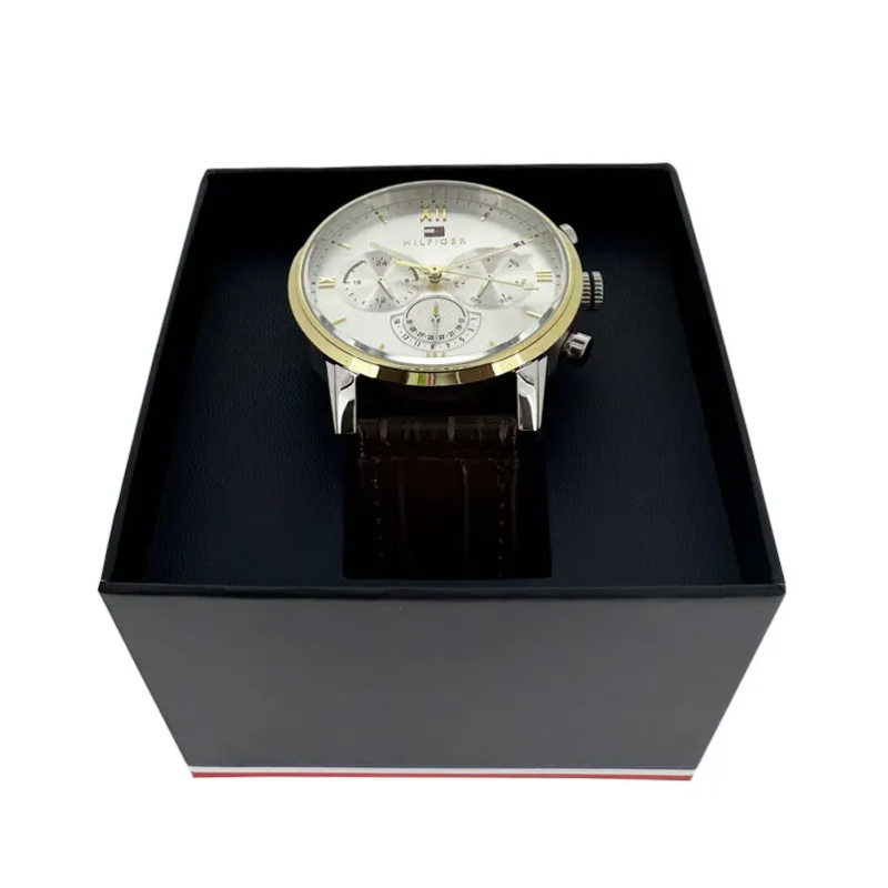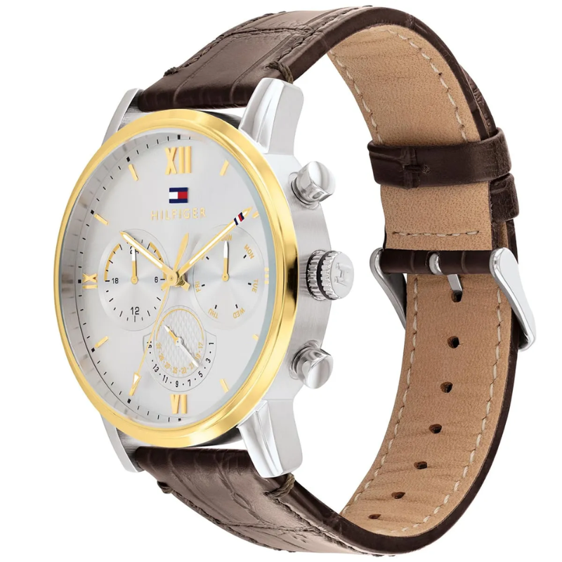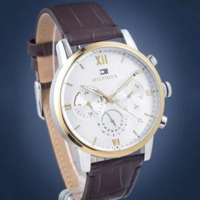 Add timelesssophistication to your collection with the Tommy Hilfiger 1791884 Men’s Watch.Featuring a classic round stainless steel case with a luxurious gold-tonebezel, this watch is designed to stand out. The silver sunray dial is accentedwith gold-tone hour markers, Roman numerals at 12 and 6 o’clock, and the iconicTommy Hilfiger flag logo.