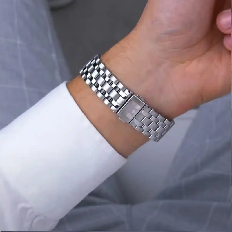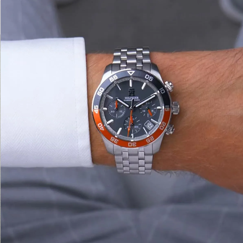 The 41 mm-diameter stainless steel case of this Tommy Hilfiger watch is equipped with a stainless-steel band. The watch has a mineral crystal and a Seiko Instruments Inc. Movement inside the case. There are five ATMs on the watch. This indicates that the watch is appropriate for taking a shower.