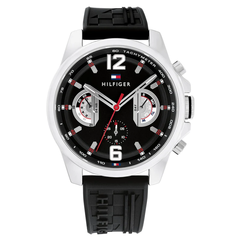 With the Tommy Hilfiger Men's Bold Sport Watch, experience the pinnacle of style and speed. The famous semi-gloss dial draws attention with its dynamic presence and bold racing-inspired sub-eye design. Essentially multipurpose, it has a date display at six o'clock, a 24-hour indicator at nine, and weekday sub-eyes at three. An additional degree of sporting sophistication is added by the silicone straps 'racing-inspired design. Tommy Hilfiger's Bold Sport Watch, which combines boldness and classic style, will let you embrace the spirit of adventure. Both silicone straps and integrated link bracelets are available.