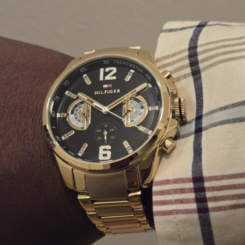Elevate your style with the Tommy Hilfiger Gold Steel Black Dial Multi-function Men's Watch. This luxurious 46mm watch features precise quartz movement, a sleek black dial, and an ionic gold-plated strap.