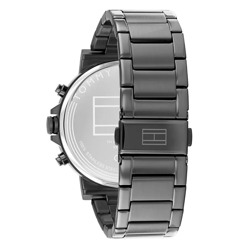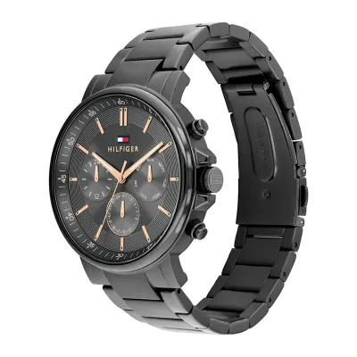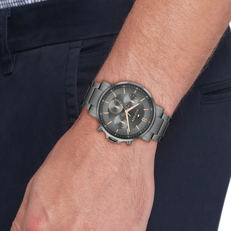 This Tommy Hilfiger men's watch features a precise quartz multifunction movement paired with a 44mm ionic plated grey steel case. Its sleek dark grey dial is protected by a durable mineral crystal, while the 22 mm grey steel strap offers comfortable wear. With a slim 9.7 mm profile, water resistance up to 5 ATM, and a secure push-button deployment clasp, this timepiece blends style with practicality for everyday use.