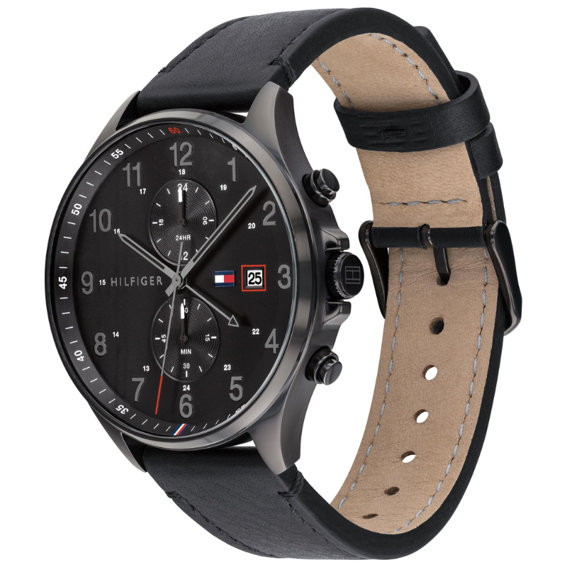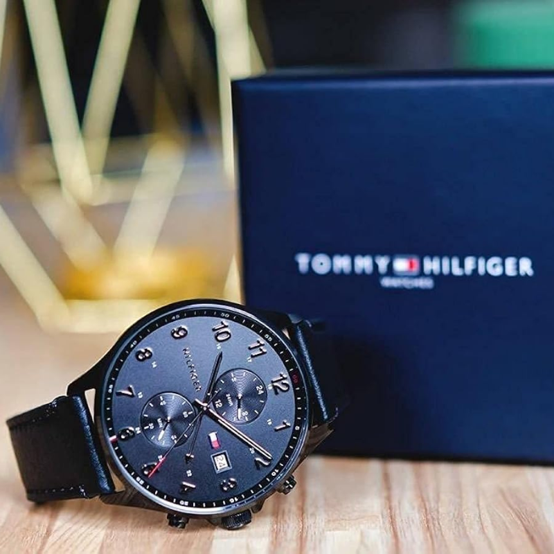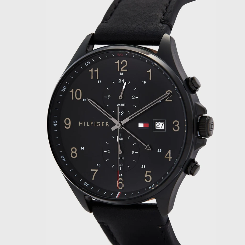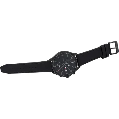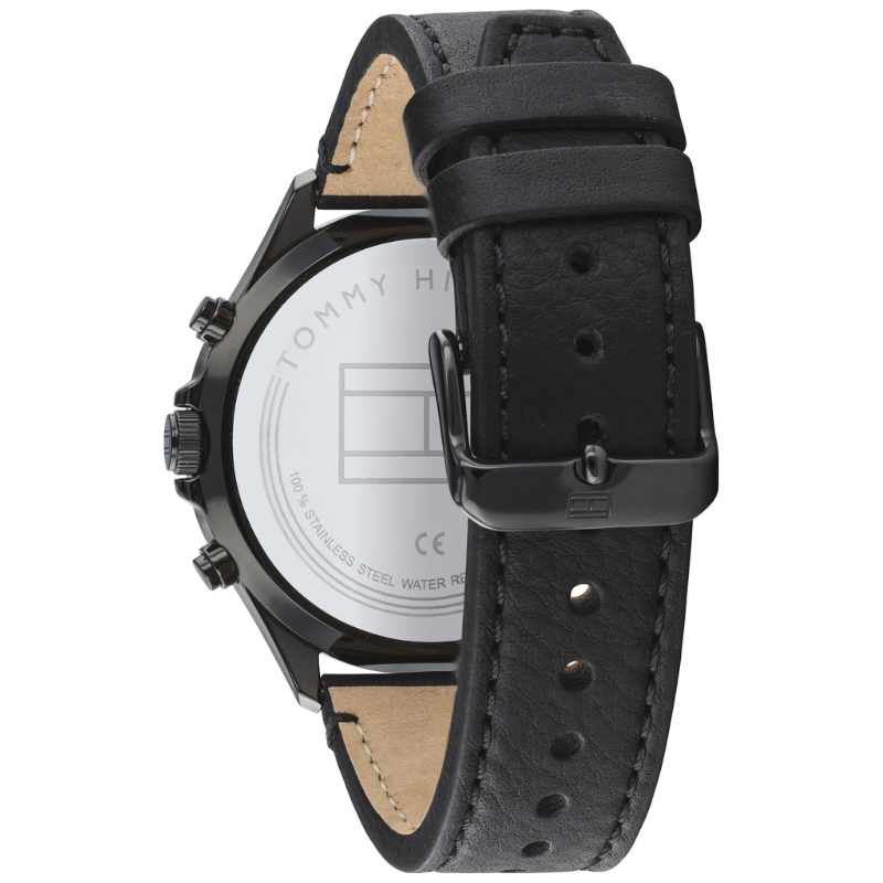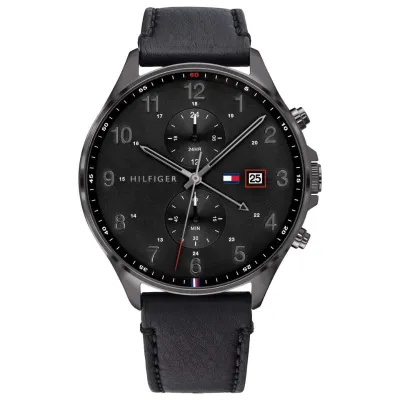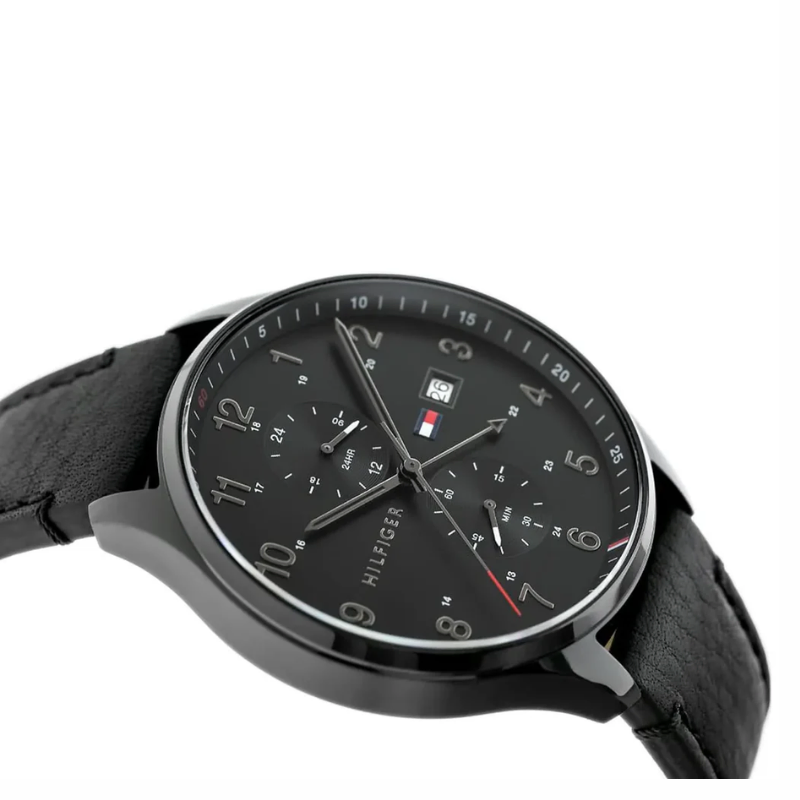 This Tommy HilfigerWest Chronograph watch for men is a stylish and functional accessory. With itsblack dial and black leather strap, it exudes a sleek and modern look. Thechronograph feature allows for precise timekeeping, making it a reliablecompanion for any occasion.
