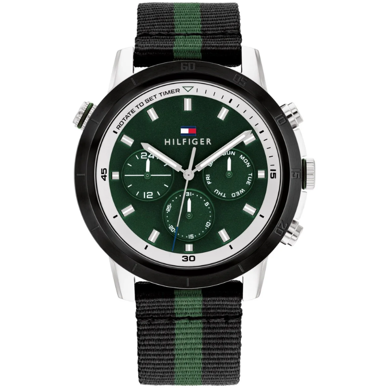 Tommy Hilfiger Men's Watch. Time is on your side with ourmodern take on the casual watch. The rugged multi-layered textured dial with arotating reflector ring is surrounded by a stainless-steel case. Multifunctionmovement and a left-side pusher (timer) will ensure that you stay on time whilelooking good. Ocean-Bound Plastic Textile Strap with recycled steel case.