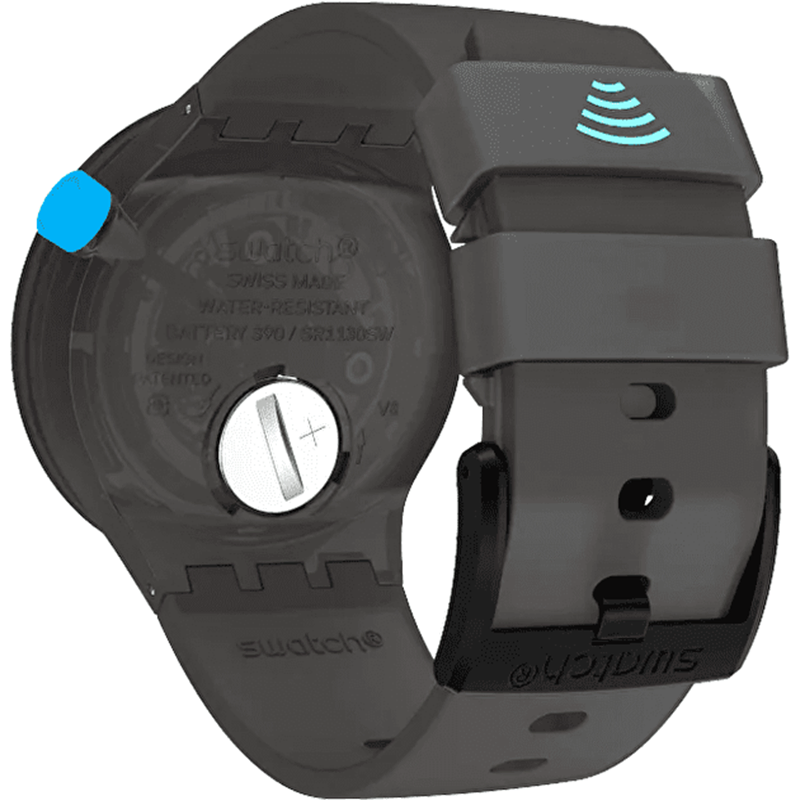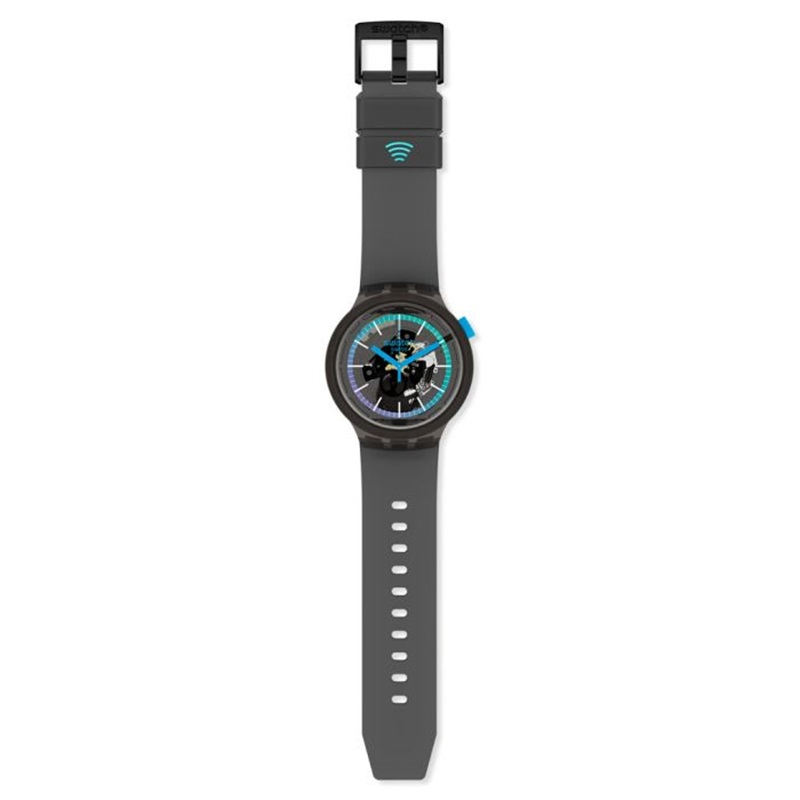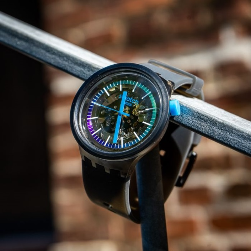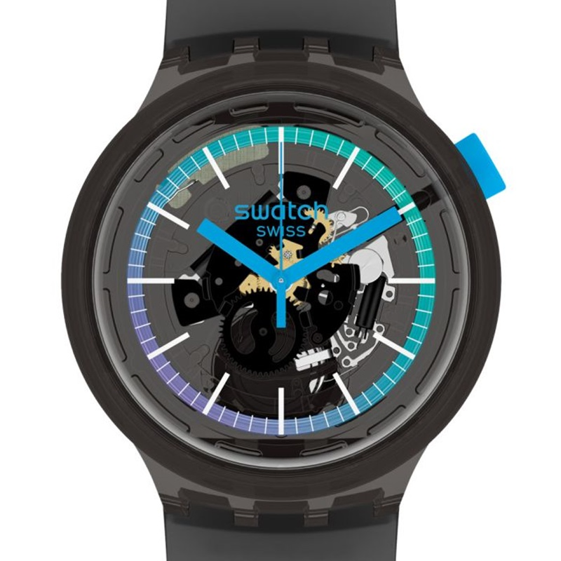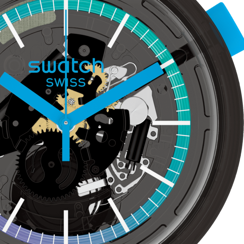 The multi-coloredprint on the transparent dial is the star of this BIG BOLD watch featuringSwatch contactless payment. A transparent matte black plastic case and siliconestrap with light blue print on the loops complete the look